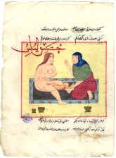 A hand-illustrated facsimile of an Ottoman Turk birthing. A rather pained looking mother is at the moment of delivery, and the midwife's left hand is pulling the baby's right arm. The mother is seated and completely nude.
