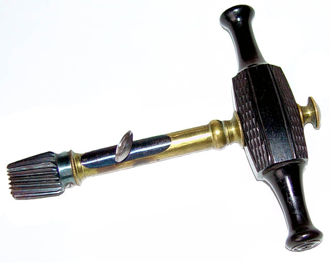 A c. 1860 antique neurosurgical trephine with ebony handle. The conical cutting crown is known as Galt's. The crown is quite narrow and the sloped sides made removing the cut bone disk easier, i.e., the diameter of the hole at the outer surface of the skull would be larger than the cut disk, itself. The centering pin works properly. The steel portions of the instrument retain most of their original protective bluing.