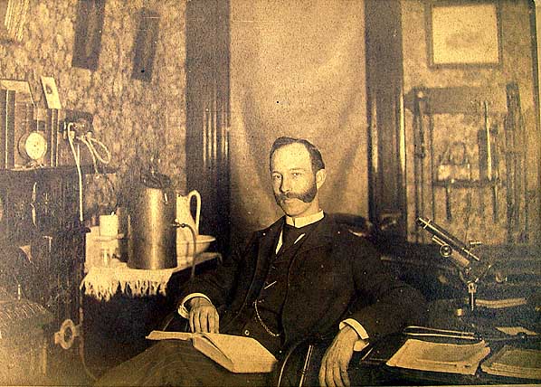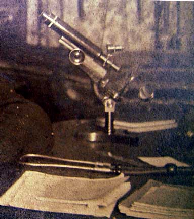 An antique photograph of a doctor in his office with a Bausch & Lomb microscope and Cammann binaural stethoscope. The image is dated May 1883.