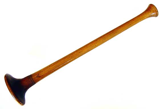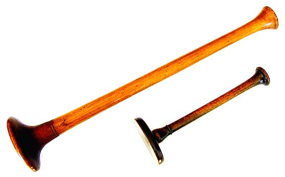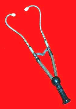 A very long (35.5cm) antique monaural stethoscope for use on patients with highly contagious diseases or otherwise objectionable to get too close to during an examination. The thought was that a longer than normal stethoscope would give added protection to the doctor. The lower picture indicates the relative size of the pauper's stethoscope next to a more commonly-sized stethoscope (17cm).