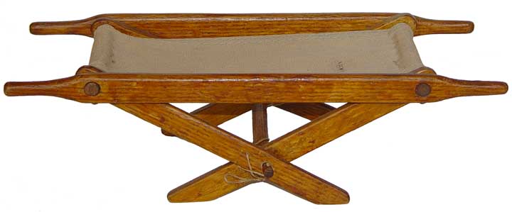 A small working model of a folding medical stretcher/cot. The canvas is stamped: ARMY. The legs of this antique stretcher can be folded-away. This is either a patent or teaching model. One foot long.