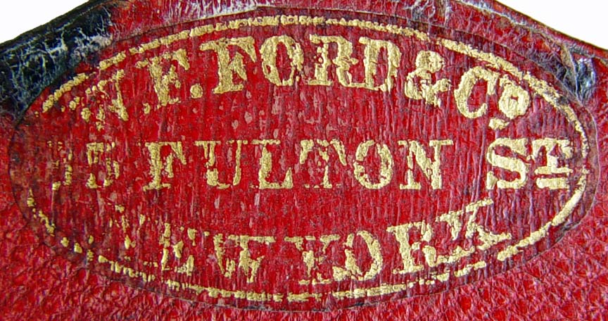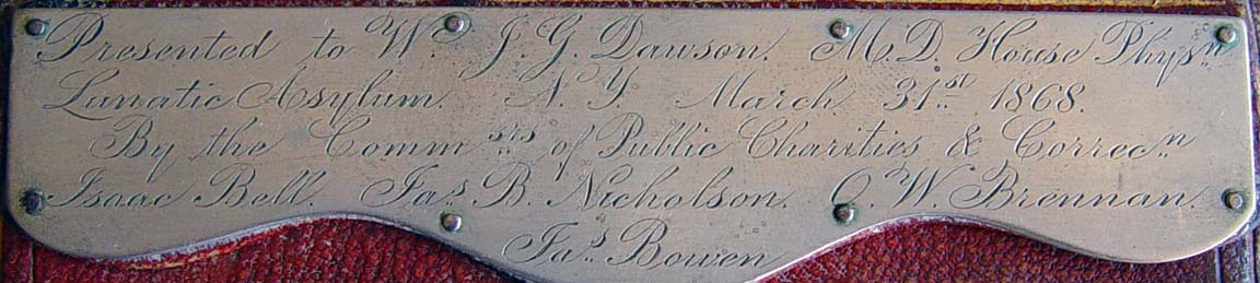 A fine minor surgery set by W.F. Ford and Co., New York, the three-part wallet in red leather with nice gilding decoration. The set includes 14 pieces, including a porcelain tipped Nelaton's bullet probe. A few of the instruments are replacements. The wonderful feature of the set is a large silver presentation plate affixed to the closing flap. The engraved plaque reads: Presented to W.J.G. Dawson MD House Phys[icia]n / Lunatic Asylum N.Y. March 31st, 1868. / By the Comm[issione]rs of Public Charities & Correc[tio]n / Isaac Bell Jas. B. Nicholson O.W. Brennan / Jas. Bowen. The jeweler engraving is of the highest quality. William Joseph Gremley Dawson (1846-1918) was born in Canada and got his medical degree from the University of New York in 1867. He moved to California and had practices in San Francisco, St Helena, and Eldridge. He was affiliated with the California Home for Feebleminded Children, and died in Eldridge in 1918. Interestingly, Edmonson's directory includes a cased Cammann stethoscope by Ford that has a plaque with a presentation to another doctor by the same four commissioners and dated six months later in 1868! See Edmonson, p. 82, fig. 103.