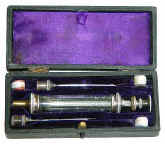 A good quality c. 1880 antique hypodermic syringe set that includes, two needles, extra plunger washers, and some wire clean-outs which are stored in the lid.