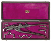 | 8. An important c. 1860s antique dental extractor stamped on handles ATTRACTIF / D ESTANQUE and MATHIEU / A PARIS. The rare complete set is contained in its fitted-case and has all 9 of its interchangeable jaws. Even the original Mathieu printed sheet of description and instructions is included. This is the most complicated mechanical tooth forceps shown in Bennion. See Bennion, Dental Antiques, p. 38 and 63, fig. 65. $6,500 |