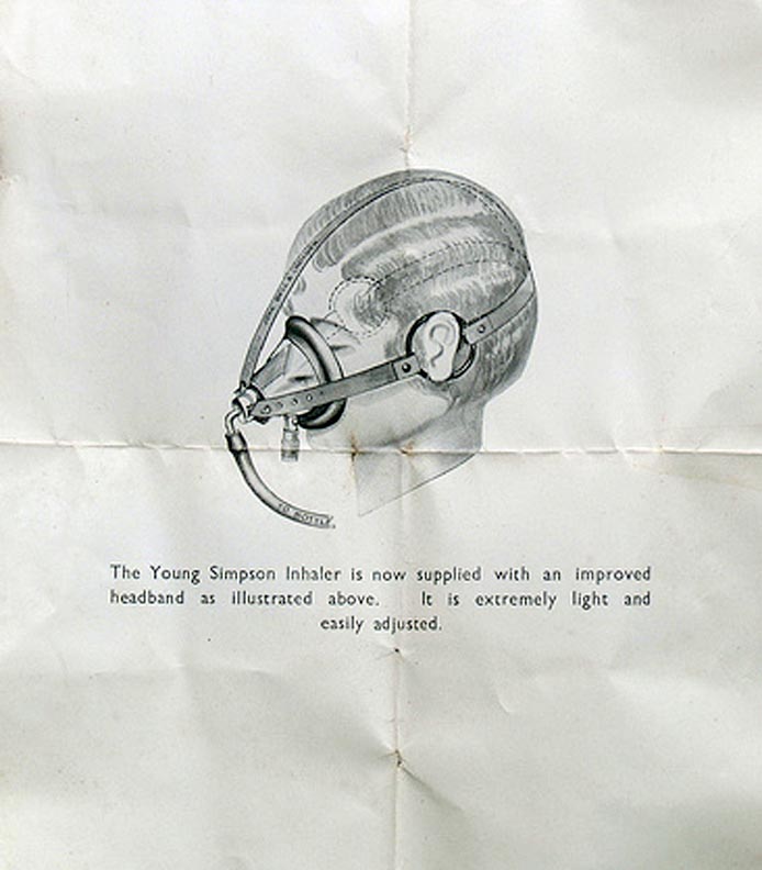 | 108. An antique c. 1930 Young Simpson anesthesia inhaler by Arnold & Son, London. The set includes a mask and headband, a print of the mask in place, bottle with cork and fittings, tubing, and the original carrying box. SOLD |