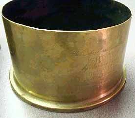 172. A World War I artillery part-shell casing that is professionally engraved: This shell was picked up on / MONT DURY / by Nursing Sister / OLIVE GOAD / in the Spring of 1919 / NEAR THE PLACE WHERE HAROLD FELL / 2nd SEPT 1918. Mont Dury, France, was the site of an August-September 1918 engagement between British and Canadian forces and the German army. For more information about this battle in which the Canadian Corps suffered 5,600 casualties, click here. A website dedicated to the history of the Canadian Nursing Sisters can be found here. The brass 4.5 howitzer shell is manufacture dated 1915 and the firing charge is dated 9/17. There are numerous other stampings, including CF (Charge loaded with cordite / Full charge) above the military property broad-arrow mark and a circled letter A followed by a dot, which indicates that the shell casing was reloaded twice. This is a poignant medical-related memorial souvenir of WWI. $475 |